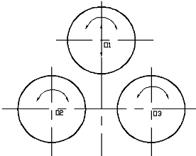 1.1:主传动指上辊绕O1,下辊分别绕O2、O3作顺时针或逆时针旋转。它是以两根下辊为主驱动 ,由主电机、主减速机、连轴器、及开式齿轮组成。工作时上辊由板料间的摩擦力带动,同时作为从动轴,起调整挤压工件的作用。辅传动由单独的传动系统控制上辊的上升或下降。由上辊升降电动机、减速机、连轴器、蜗轮、蜗杆、丝母、丝杆组成。工作时,由减速机带动蜗杆转动蜗轮内丝母旋转,使丝杆及上辊轴承座作升降运动,使上辊上升或下降。卷板时,在上辊的下降压力下,通过两下辊正反转动,使板料达到所需的曲率,形成预计的圆形或弧形。