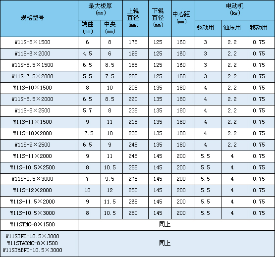 该机属于液压型三辊卷板机,用于常温状态下将各种容器用碳钢、低合金钢一次上料后不需调头即完成板材端部预弯、卷圆和矫圆等工序。 上辊可以垂直移动、水平移动。 预弯通过上辊水平移动,使上辊相对于下辊呈非对称位置来实现。